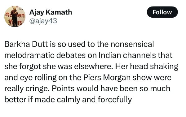 The most prominent example of the difference in Pakistani and Indian narratives was perhaps the segment on the Piers Morgan show where guests Hina Rabbani Khar, previous Minister of Foreign Affairs in Pakistan and podcast host and comedian Shehzad Ghias Sheikh were joined by Indian journalist Barkha Dutt and podcaster Ranveer Allahbadia. While Dutt and Allahbadia spent the segment making faces while the Pakistani guests spoke, the latter two came off as a lot more composed, with many Indians also calling out the Indian panelists for their behaviour.